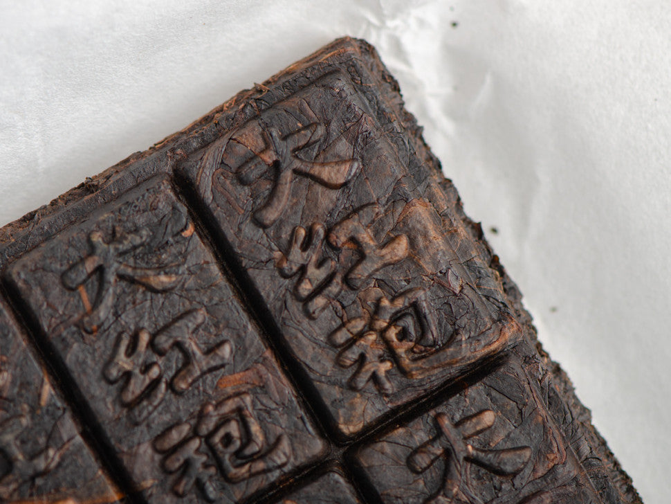 Wuyishan oolong Da Hong Pao, pressed in a dense 100 g plate. For ease of brewing, the plate is divided into squares.